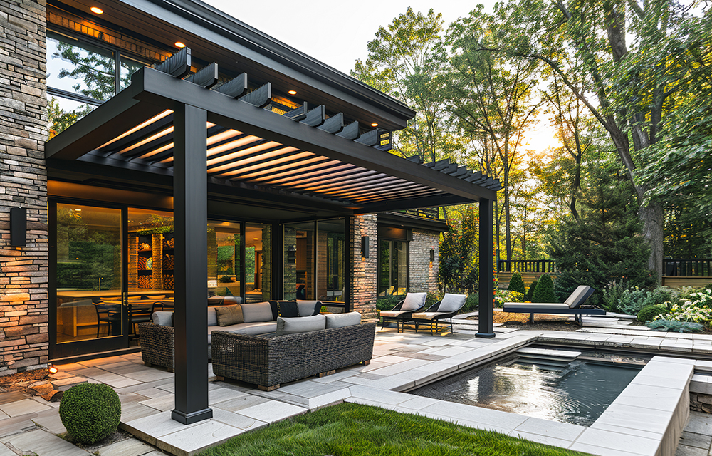 Permanent shade structures introduce scale and definition while reinforcing architectural continuity. Rooflines, column detailing, cladding materials, and integrated lighting are coordinated with structural requirements to create true outdoor rooms — refined, durable, and proportioned intentionally.