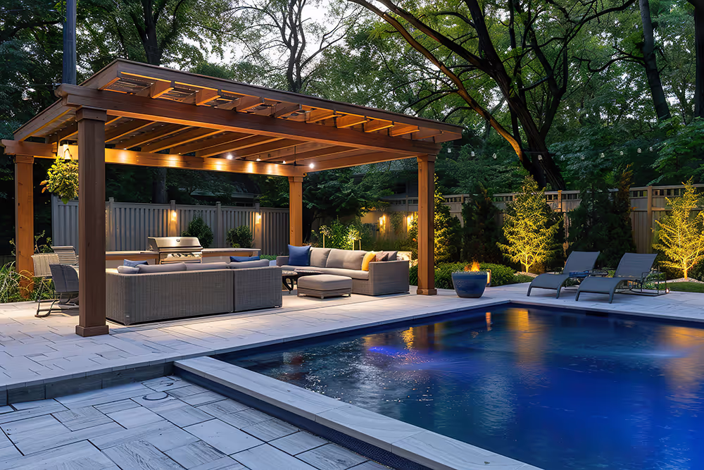 Projects incorporating pools, covered structures, premium outdoor kitchens, engineered hardscape, and coordinated landscape design vary based on site conditions and scope.